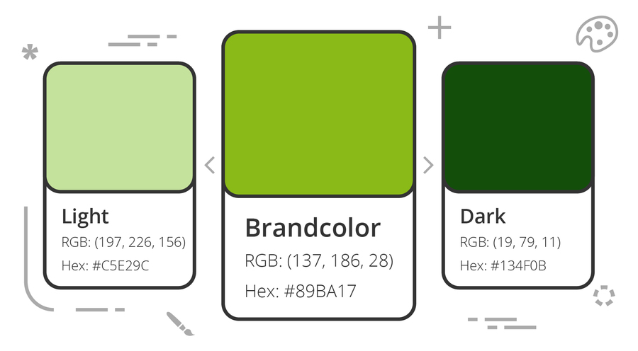 Farben sind eines der wichtigsten Merkmale, um eine App zu Ihrer App zu machen. Deshalb entscheiden Sie über die primäre Farbe Ihrer App. Um sowohl die Lesbarkeit als auch Kontraste zu berücksichtigen, empfehlen wir, eine „dark“ und „light“ Version davon abzuleiten. Diese Entscheidung wird im späteren Prozess bei den Formularen sehr wichtig sein. Außerdem wirkt sich Ihre Farbwahl auf die Präsentation Ihrer Dienste in der App aus – Sie definieren, ob alle Dienste einheitlich in einer Farbe, in Farbvariationen oder in einer kompletten Farbwelt – so bunt wie der Regenbogen – erscheinen sollen.