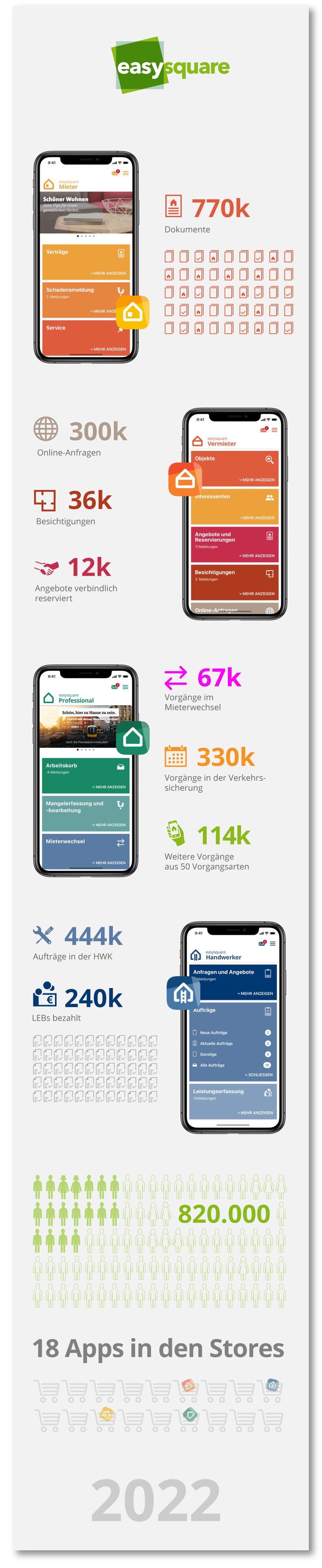 Mittlerweile stattet easysquare Kundinnen und Kunden über ganz Deutschland, und auch über die Landesgrenzen hinaus in der Schweiz und Österreich, aus. Namhafte Wohnungsunternehmen haben die innovativen Digitallösungen von easysquare erfolgreich eingeführt. Wir sind mit jeweils 18 Apps im Apple Store und Google Play Store vertreten. Was das in Zahlen für 2022 konkret bedeutet? Bitte schön:
